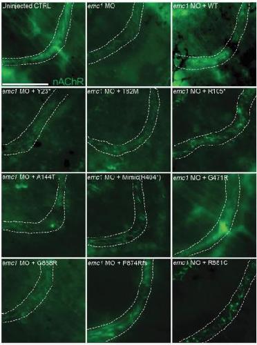Supplemental Figure 8 Knockdown of emc1 in Xenopus results in abnormal nAChR signal in tail neuromuscular junctions that can be rescued through exogenous introduction of human EMC1. Injection of wildtype EMC1 mRNA and to a lesser extent p.Gly471Arg (c.1411G>C) variant mRNA restores nAChR patterns of expression in emc1 depleted tail neuromuscular tissue while mRNA of other variants do not. Three replicates of 8 embryos were analyzed for each condition. Scale bar indicates 50 μm. Images of uninjected control and emc1 MO labeling of nAChR are from subregions of images shown in Figure 4C. |