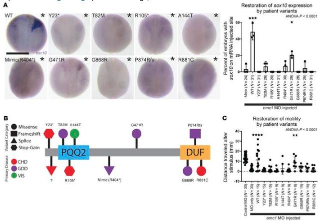 Figure 7. Injection of wild-type EMC1 mRNA and to a lesser extent p.Gly471Arg (c.1411G>C) variant mRNA restored sox10 expression and tadpole movement in emc1-depleted embryos, whereas the mRNA of all other variants did not. (A) Representative images and percentages of embryos with sox10 expression after injection with emc1 MO at the 1-cell stage followed by injection with wild-type (n = 31) or variant EMC1 mRNA (n = 31 for Y23*, 29 for T82M, 20 for R105*, 31 for A144T, 30 for R404*, 29 for G471R, 28 for G868R, 25 for P874Rfs, and 31 for R881C) in 1 cell of the 2-cell stage over 3 biological replicates (injected halves of embryos are indicated by asterisks). Scale bar: 500 μm. (B) Schematic diagram of EMC1 protein with domain annotations and locations and effects of patient variants. CHD, congenital heart disease; GDD, global developmental delay; VIS, vision impairment; PQQ2, pyrrolo-quinoline quinone redox coenzyme domain; DUF, domain of unknown function. (C) Measurement of tadpole motility after coinjection with emc1 MO and wild-type (n = 15) or variant EMC1 mRNA (n = 15 for Y23*, 15 for T82M, 9 for R105*, 9 for A144T, 9 for R404*, 8 for G471R, 10 for G868R, 16 for P874Rfs, and 12 for R881C) at the 1 cell stage over 3 biological replicates. ANOVA P values were calculated as a comparison of mock injection to all other groups (A) and MO only to all other groups (C). ****P < 0.0001, **P < 0.005, *P < 0.05 by post hoc Tukeyâs test of multiple comparisons of mock injection to all other groups (A) and MO only to all other emc1 MO-injected groups (C). Bars indicate mean and SD. |