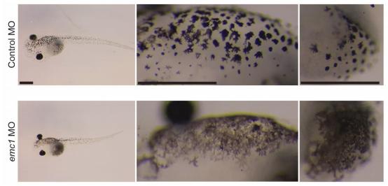Supplemental Figure 1 Knockdown of emc1 causes abnormal pigment cell morphology. Representative images of control MO and emc1 MO injected stage 45 embryo pigment cell morphology. 30 embryos were imaged for each condition over 3 biological replicates. Scale bar indicates 500 μm |