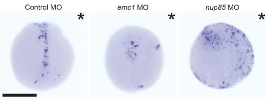 Supplemental Figure 4 TUNEL staining for cell death of St 20 embryos injected with MO in one cell at the two-cell stage. Representative images of embryos injected with control, emc1, or nup85 MO affecting half of the embryo (indicated by asterisk side). Three replicates of 10 embryos were analyzed for each condition. Scale bar indicates 500 μm. |