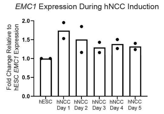 Supplemental Figure 6 EMC1 expression during early human neural crest cell induction. qPCR analysis of EMC1 transcripts during the human NCC induction protocol shows a sustained level of EMC1 transcripts within one day after beginning induction for 2 biological replicates at each time point. |