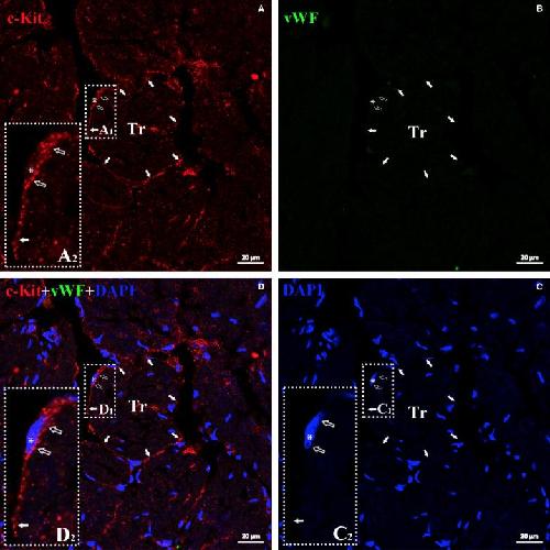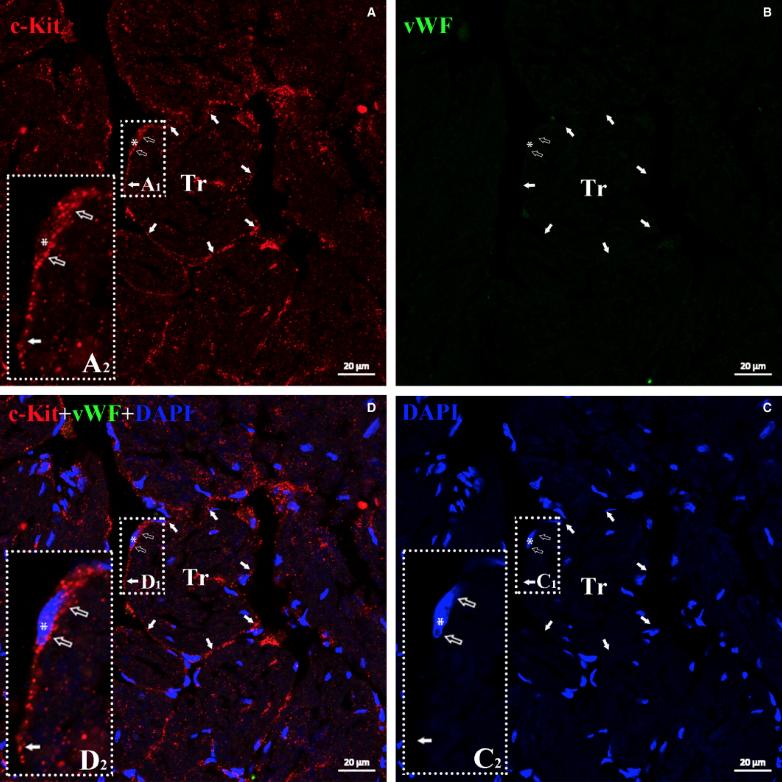 Figure 2. TEM identified CTs in myocardium is câKitâpositive but vWFânegative. Double immuofluorescent staining for antiâcâKit (red) and vWF (green) demonstrated câKit+ and vWFâ cells with very small cell bodies (open arrow), a nucleus (approximately 1:1 ratio of the cytoplasm to the nucleus; white asterisk) and extremely thin prolongation (telopode) around trabeculae in the Xenopus tropicalis myocardium (white arrow). Showing that TEM identified CTs express câKit, a generally accepted marker of CTs, but not vWF, a unique marker of endothelial cell. A, AntiâcâKit (red); B, AntiâvWF (green); C, DAPI; D, merged of A, B and C. A2, C2 and D2 are higher magnification of A1, C1 and D1, respectively, which are showing the cell body and part of telopode of CTs. Scale bar: 20 μm. Tr: Trabecula of the myocardium |
