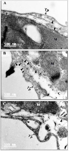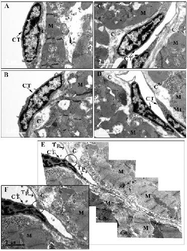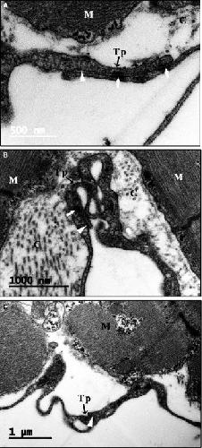 Figure 5. Telopodeâtelopode contact. Most of the CTs link with other CTs via connections between the far ends of their telopodes (AâC). Two types of telopodeâtelopode contacts are observed: (1) a gapâjunctionâlike structure coming into nanometerârange contact, in which some areas make nanometerârange contact and other areas have a structure resembling one to two gap junctions (white arrow); (2) a nanometerârange contact that does not have a wellâestablished junction at the far end of the telopodes in which two telopodes closely connect at a distance of approximately 1â2 nm (white small triangle). Scale bar: Size as shown in the figures. C: Collagen and extracellular matrix; M: Cardiomyocyte; Tp: Telopode |