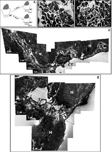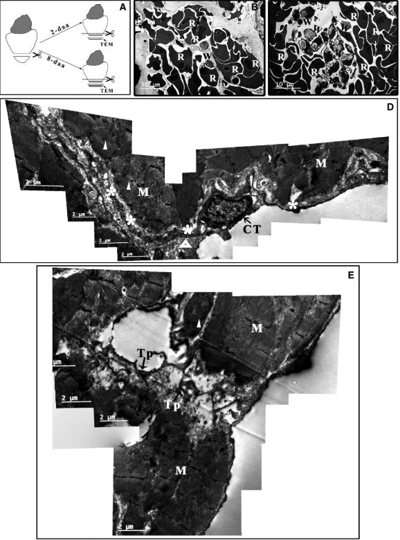 Figure 6. TEM analysis of the Xenopus tropicalis myocardium 2 d after injury. A, Schematics of the region of TEM analysis. Two days after amputation, red blood cells (B) and inflammatory cells (C) accumulate in the wound. Myofibres are disorganized in some cardiomyocytes on the border of the wound (white triangle), and disorganized telopodes of some CTs (white asterisk) are found. There are some clot structures in the extracellular space (open triangle) (D). In addition, some network structures consisting of disorganized telopodes and extracellular matrix tissue but lacking cardiomyocytes are present in the wound area (E). Scale bar: Size as shown in the figures. Asterisk: Disorganized telopode; C: Collagen and extracellular matrix; CT: Cardiac telocyte; M: Cardiomyocyte; Open triangle: Clot structure; R: Red blood cell; Tp: Telopode; W: Inflammatory cell; White Triangle: Disorganized myofibre |