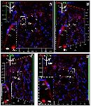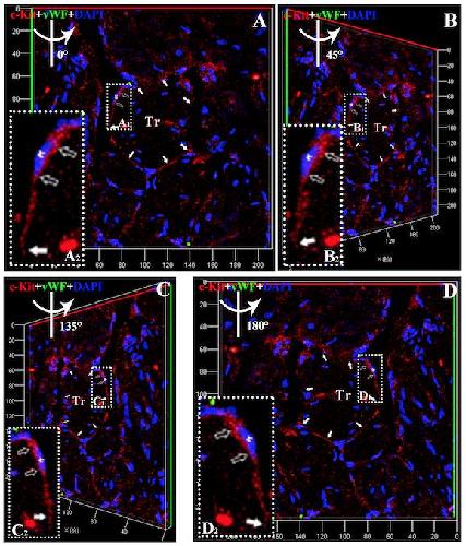 Fig. S1: Three-dimensional reconstruction of Figure 2D. A: Three-dimensional reconstruction of Figure 2 in Z-axis. B: 45 degree rotation of A in y-axis. C: 135 degree rotation of A in y-axis. D: 180 degree rotation of A in y-axis. Showing CTs (c-Kit positive) is around the trabeculae of X. tropicalis myocardium (white arrow) and the representative cell body (open arrow) and part of telopode of CTs (white arrow) in higher magnification (A2-D2) of selected area (white dot line rectangle; A1-D1) respectively. Red: anti-c-Kit; Green: anti-vWF, Blue: DAPI. Tr: Trabecula of the myocardium. |