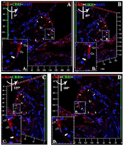 Fig. S3: Three-dimensional reconstruction of Figure S2D. A: Three-dimensional reconstruction of Figure S2 in Z-axis. B: 45 degree rotation of A in y-axis. C: 135 degree rotation of A in y-axis. D: 180 degree rotation of A in y-axis. Showing CTs (c-Kit positive) is around the trabeculae of X. tropicalis myocardium (white arrow) and the representative cell body (open arrow) and part of telopode of CTs (white arrow) in higher magnification (A2-D2) of selected area (white dot line rectangle; A1-D1) respectively. Red: anti-c-Kit; Green: anti-vWF; Blue: DAPI. Tr: Trabecula of the myocardium. |