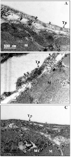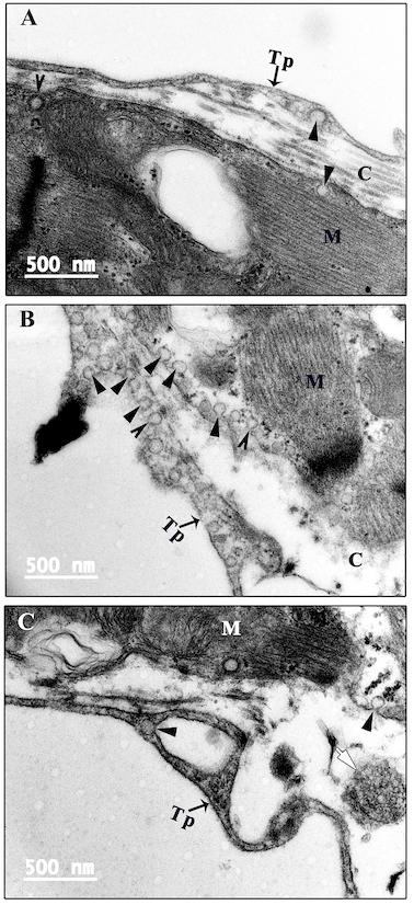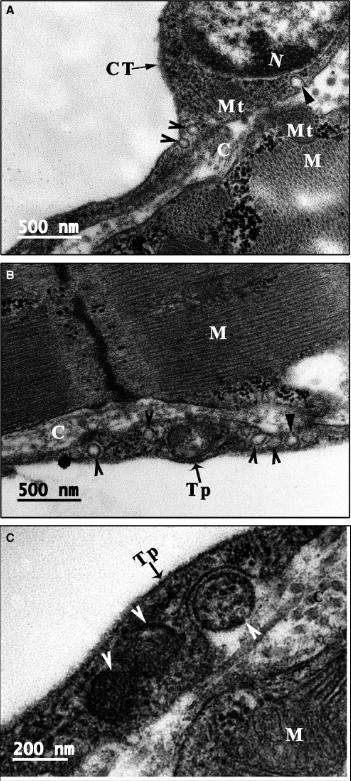 Figure 4. Vesicles and caveolae of CTs. Many vesicles (arrowhead) or coated vesicles (white arrowhead) are present in the telopodes. In addition, many caveolae are present in the membrane of the cell body and telopode (small triangle). The opening site of caveolae faces the extracellular space, and some vesicles or coated vesicles are located near the opening site of caveolae (AâC). C: Collagen and extracellular matrix; CT: Cardiac telocyte; M: Cardiomyocyte; Mt: Mitochondria; N: Nucleus. Scale bar: Size as shown in the figures; Tp: Telopode |
