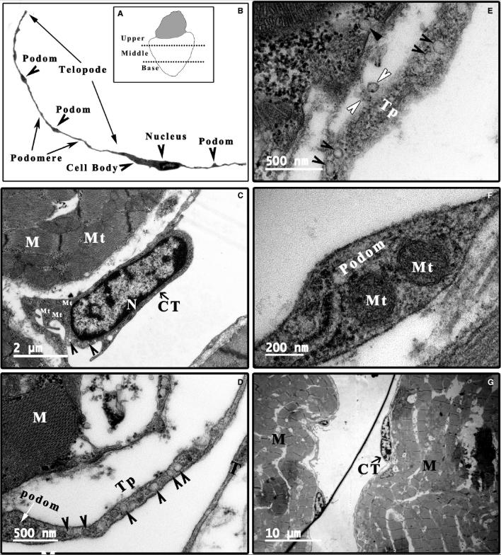 Figure 1. TEM analysis of the morphology of CTs in the Xenopus tropicalis heart. A, Schematic of the upper region, middle region and base of the X tropicalis heart for TEM analysis. B, Representative CTs with a hallmark ultrastructural morphology: a thin perinuclear rim of cytoplasm with few organelles and thin cytoplasmic veils containing mitochondria. Long telopodes (up to 100 μm), which represent cellular prolongations of the telocytes with moniliform (segments approximately 100 nm thick, named podoms) processes. C, A representative CT cell body (arrowhead: microvesicle). D, A representative telopode with podom (white arrow: podom; arrowhead: microvesicle). E, A representative telopode with many microvesicles (arrowhead) and secreted microvesicle (white arrowhead). F, A representative podom containing mitochondria. G, CTs in mitosis. CT: Cardiac telocyte; M: Cardiomyocyte; Mt: Mitochondria; N: Nucleus; Scale bar: Size as shown in the figures; Tp: Telopode |