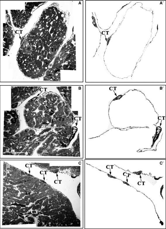 Figure 3. Distribution of CTs in the upper region, middle region and base of the Xenopus tropicalis myocardium. CTs mainly concentrated on the outer surface of trabeculae containing cardiomyocytes in the upper region (A), middle region (B) and base (C) of the X tropicalis myocardium. Most of the trabeculae are twined around one, two or several CTs and their telopodes or with telopodes alone. Aâ², Bâ² and Câ²: CTs of A, B and C that are not included in the trabecular structure; CT: Cardiac telocyte; Scale bar: Size as shown in the figures; Tr: Trabecula of the myocardium |