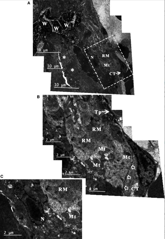 Figure 7. TEM analysis of the Xenopus tropicalis myocardium 8 d after injury. Eight days after injury, some of the injured muscle fibres regenerated via a novel muscle fibre characterized by an irregular muscle fibril arrangement and irregular sarcomere (RM) as well as regenerated sarcolemma (open arrow). An accumulation of mitochondria is seen in the regenerated muscle fibres (A, B), and a karyokinesisâlike nucleus was found in the border cardiomyocytes of regenerated myofibres (C). In addition, CTs with normal morphology are found on the outer surface of regenerated myofibres (A, B). B: Higherâpower view of the dotted line rectangle in A. Scale bar: Size as shown in the figures. Asterisk: Cardiomyocyte; CT: Cardiac telocyte; Mt: Mitochondria; N: Nucleus; RM: Regenerated myofibres; Tp: Telopode; W: Inflammatory cell |