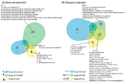 Figure 3. Venn diagrams of gene ontology (GO) terms enriched in skin of early- (E), mid- (M) and late- (L) larval stages from (A) Rana ornativentris and (B) Xenopus tropicalis. Number of immune-related enriched GO terms are in black (full list in Tables S5 and S6), and total number of enriched GO terms belonging to the âbiological processâ parent category are in grey and also represented by circle sizes. Examples of enriched immune-related GO terms are listed in comparisons between stages (full list in Tables S5 and S6).