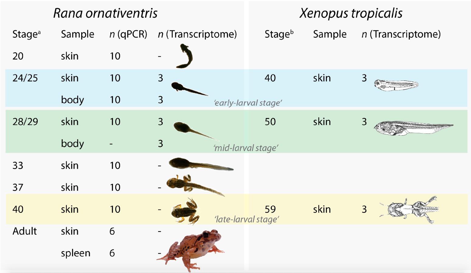Figure 1. Overview of Rana ornativentris and Xenopus tropicalis samples used for qPCR and transcriptome analyses in this study. a R. ornativentris stage approximations based on Tahara [19,20]. b X. tropicalis stage approximations based on Nieuwkoop and Faber [23]. Full stage approximations in Table S1. Images of frogs in all figures are not to scale (source: Q. Lau for R. ornativentris, Nieuwkoop and Faber (1994) via Xenbase for X. tropicalis).
