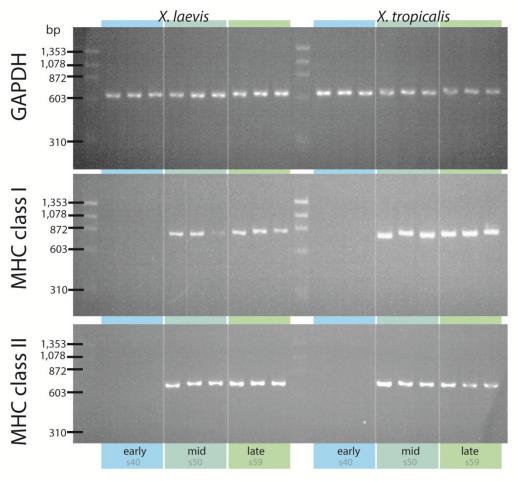 Figure S1. Gel electrophoresis following PCR amplification of GAPDH, MHC class I, and MHC class II from early-, mid-, and late-larval stages of Xenopus laevis and X. tropicalis tadpoleskin cDNA samples (n =3 per stage per species).