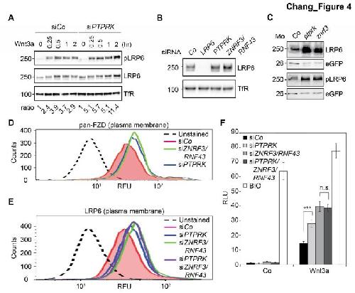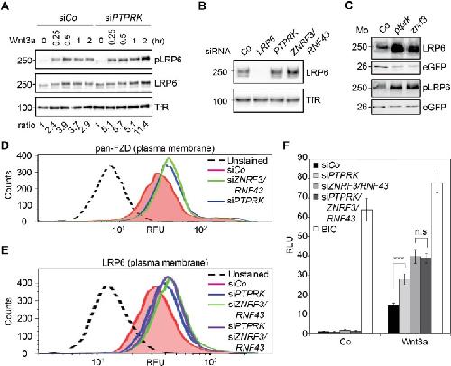 Figure 4 | PTPRK reduces Fzd and LRP6 surface levels via ZNRF3/RNF43 (A) Western blots analysis of membrane fractions from H1703 cells upon siRNA transfection. Cells were treated with Wnt3a for the indicated time and were analyzed. Ratio, phospho-LRP6 (pLRP6) levels normalized to control (transferrin receptor, TfR). Representative results from three independent experiments with similar outcome are shown. (B) Western blots analysis of membrane fractions from H1703 cells upon siRNA transfection. Transferrin receptor (TfR) served as loading control. Representative results from three independent experiments with similar outcome are shown. (C) Western blot analysis of LRP6 and phospho-LRP6 (pLRP6) in neurula (stage 18) embryos injected with LRP6 RNA, eGFP RNA and indicated Mo. eGFP served as an injection control. Data show one representative result from three independent experiments. (D) Flow cytometric analysis of cell surface Frizzled receptors (pan-Fzd antibody) in H1703 cells upon siRNA knockdown of PTPRK or ZNRF3/RNF43. Only live cells were counted and dead cells were gated out by propidium iodide (PI) staining. Dashed line, unstained H1703 cells. RFU, relative fluorescence units. (E) Flow cytometric analysis of cell surface LRP6 in H1703 cells upon siRNA depletion of PTPRK, ZNRF3/RNF43 or combination of both. Only live cells were counted and dead cells were gated out by propidium iodide (PI) staining. Dashed line, unstained H1703 cells. RFU, relative fluorescence units. (F) Topflash reporter assay in H1703 cells upon transfection of indicated siRNAs. Cells were treated with Wnt3a with or without 20 μM BIO for 24 h before measurement. (Mean ± SD, n=3; ***P < 0.001, n.s., not significant, student t-test). RLU, relative light. |