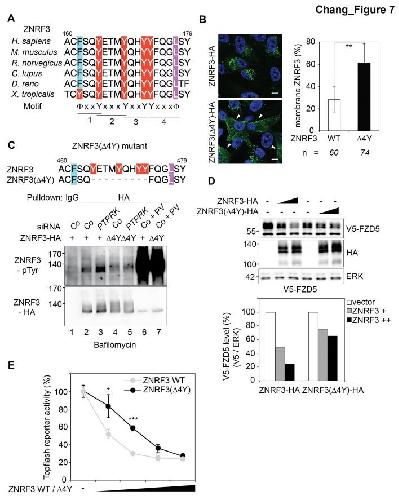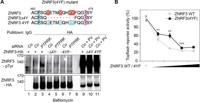 Figure 7 â figure supplement 1 | Phenylalanine mutation in ZNRF3 4Y motif impairs PTPRK regulation (A) Tyrosine phosphorylation of the indicated Wt and mutant ZNRF3 constructs in H1703 cells upon siRNA transfection and bafilomycin treatment overnight. As control, cells were treated with Na1146 pervanadate (PV, phosphatase inhibitor) for 30 min before harvest. Lysates were pulled down with anti-HA antibody or control IgG and subjected to Western blot analysis. (B) Topflash reporter assay in H1703 cells upon transfection of different amount of the indicated Wt and mutant ZNRF3 plasmids. All samples were Wnt3a treated for 24 h before measurement. (Mean ± SD, n=3; **P < 0.005, ***P < 0.001, student t-test). Topflash activity without ZNRF3 transfection was set to 100%. A representative result from three independent experiments with similar outcomes is shown. |