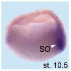 znrf3 (zinc and ring finger 3) gene expression, assayed through in situ hybridization in hemisected Xenopus tropicalis embryo,at NF stage 10.5, dorsal right. |