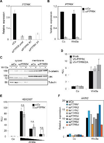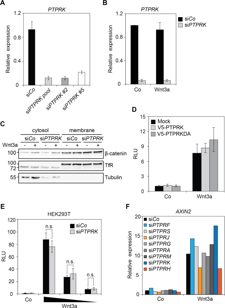 Figure 1 â figure supplement 1 | Knockdown efficiency of siPTPRKs. (A) qRT-PCR analysis showing the knockdown efficiencies of siRNAs targeting PTPRK in H1703 cells (related to Figure 1A). (B) qRT-PCR analysis of PTPRK in H1703 cells upon siCo or siPTPRK transfection (related to Figure 1B). (C) Subcellular fractionation of H1703 cells upon siCo or siPTPRK transfection. Cells were treated with Wnt3a for 24 h before harvest and fractionated into cytosol and membrane as indicated. Tubulin and Transferrin receptor (TfR) serve as the markers for cytosolic and membrane fractions, respectively. (D) Topflash reporter assay in H1703 cells transfected with V5-PTPRK or V5-PTPRK-DA. Cells were treated with control or Wnt3a for 24 h before harvest and measured for Topflash activity (Mean ± SD). (E) Topflash reporter assay in HEK293T cells upon siRNA treatment. Cells were treated with control or dilutions of Wnt3a for 24 h before harvest and measured for Topflash activity. (Mean ± SD, n=3; n.s., not significant, student t-test). (F) qRT-PCR analysis of AXIN2 in H1703 cells treated with Wnt3a overnight upon indicated siRNA transfection. |