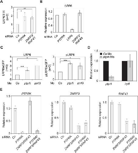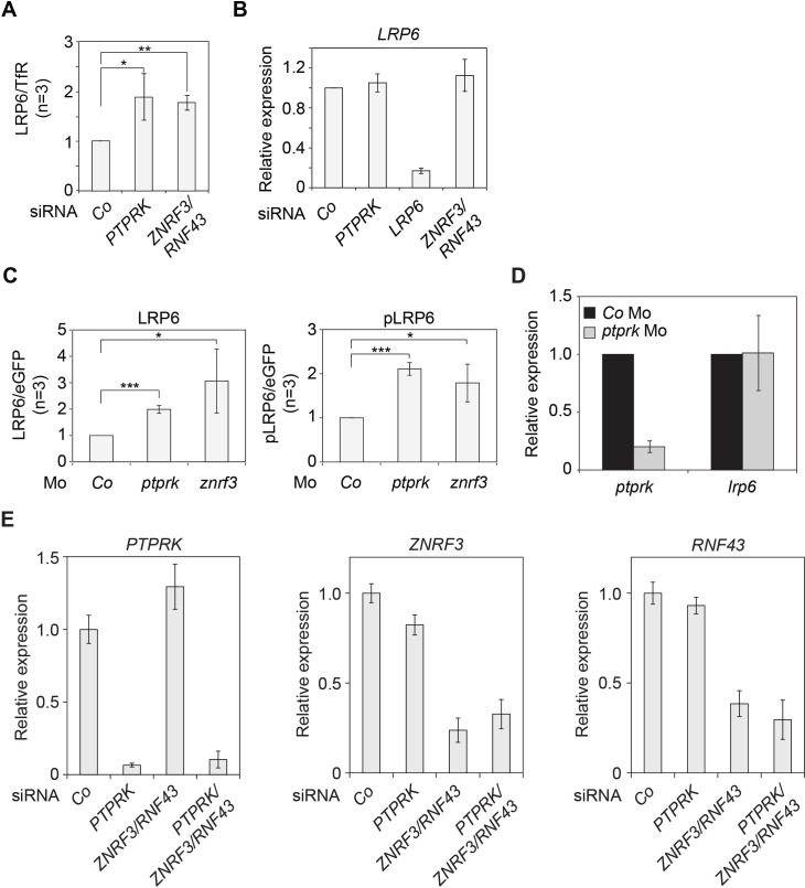 Figure 4 â figure supplement 1 | PTPRK regulates LRP6 protein- but not mRNA levels. (A) Quantification of relative LRP6 protein levels normalized to TfR in Figure 4B. (B) qRT-PCR analysis of LRP6 mRNA levels in H1703 cells transfected with indicated siRNAs. mRNA expression was normalized to GAPDH, and the level of LRP6 in siCo was set to 1. (C) Quantification of the protein levels of LRP6 (left) and phospho-LRP6 (pLRP6, right) shown in Figure 4C. Levels of LRP6 or phospho-LRP6 were normalized to eGFP and protein levels in Co Mo injected embryos were set to 1. (D) qRT-PCR analysis of ptprk and lrp6 mRNA levels in Co Mo or ptprk Mo injected neurula embryos (stage 18) in Figure 4C. The expression level in Co Mo injected embryos was set to 1. (E) qRT-PCR analysis showing the knockdown efficiencies of the indicated siRNAs in H1703 cells (related to Figure 4F). Statistics was performed with three independent experiments (Mean ± SD, *P < 0.05, **P < 0.01, ***P < 0.001). |
