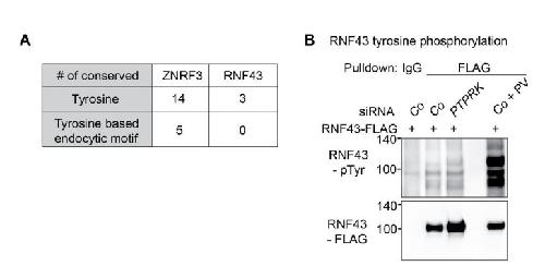 Author response image 3. siPTPRK does not affect tyrosine phosphorylation of RNF43.(A) Table showing the comparison of multiple sequence alignment result of ZNRF3 and RNF43 intracellular domain among different species including H. sapiens, M. musculus, R. norvegicus, C. lupus, D. rerio and X. tropicalis. (B) siPTPRK does not affect tyrosine phosphorylation of RNF43. Tyrosine phosphorylation of RNF43-FLAG in H1703 cells was analyzed in bafilomycin treated cells. As a control, cells were treated with Na-pervanadate (PV, phosphatase inhibitor) for 30 min before harvest. Lysates were pulled down with anti-FLAG antibody or control IgG and subjected to Western blot analysis. A representative result from two independent experiments with similar outcomes is shown. |