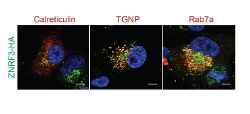 Author response image 5. PTPRK resides in secretory vesicles and endosomes.Immunofluorescence microscopy showing colocalization of ZNRF3-HA (green) with mCherry-Calreticulin, mCherry-TGNP or mCherry-Rab7a (red). |