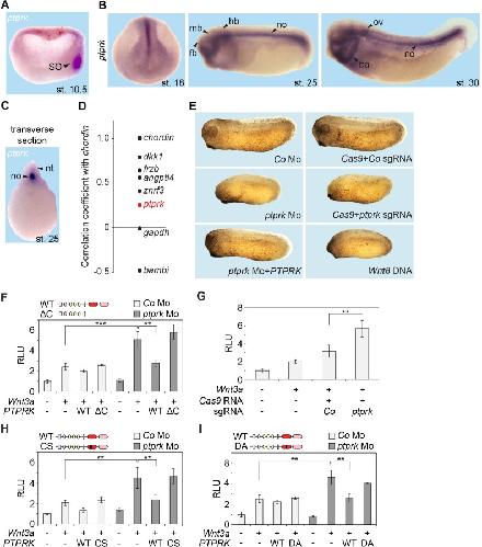 Figure 2. Ptprk inhibits Wnt signaling in the Xenopus Spemann organizer.(AâC) In situ hybridization of ptprk in Xenopus tropicalis at (A) gastrula (hemisected, dorsal to the right), (B) neurula, tailbud, and tadpole stages, and in (C) transverse dissected tailbud embryo. ba, branchial arches; fb, forebrain; hb, hindbrain; mb, midbrain; no, notochord; nt, neural tube; ov, otic vesicle; SO, Spemann organizer. (D) Data mining using data from Ding et al. (2017), showing gene expression correlation with a dorsal/organizer marker chordin. Xenopus dkk1, frzb, and angptl4 are known organizer-expressed genes, gapdh is shown as housekeeping gene, and bambi is a ventrally expressed gene. (E) Representative phenotypes of tailbud stage Xenopus tropicalis embryos injected animally at 2- to 8 cell stage and as indicated. For quantification, see Figure 2âfigure supplement 1DâE. (FâI) Topflash reporter assays performed with neurulae (stage 18). Embryos were injected animally at 2- to 8 cell stage (F, HâI) or one cell stage (G) with reporter plasmids and the indicated mRNAs and Mos. Domain structures of WT PTPRK and mutants are shown on top. Normalized Topflash activity of Co-injected embryos only with reporter plasmids was set to 1. Data in all graphs are displayed as means ± SD, and show one representative of multiple independent experiments with three biological replicates. RLU, relative light units. **p<0.01, ***p<0.001.Figure 2âfigure supplement 1. Spatiotemporal expression and knockdown of ptprk in Xenopus embryos.(A) qRT-PCR analysis displaying the relative expression levels of ptprk in Xenopus tropicalis embryos at indicated stages. Expression of ptprk was normalized to odc, and the level of ptprk at stage one was set to 1. Data show one representative result from three independent experiments. (B) Spatial expression patterns of ptprk in Xenopus embryos at 2 cell stage (animal view) and stage 7 (animal view). (C) Knockdown efficiency of ptprk Mo. qRT-PCR analysis was performed with uninjected tailbud stage Xenopus embryos, and embryos injected with Co or ptprk Mo. (DâE) Quantification of phenotypes shown in Figure 2E. The number of embryos is indicated on the top. (F) Scheme of validation of CRISPR/Cas9-mediated genome modification by restriction enzyme digestion. Xenopus ptprk sgRNA targeted sequence contains a StuI site. A pair of primers was designed to amplify a DNA fragment of 1009 bp. After StuI digestion, wild-type (WT) but not edited DNA, yields DNA fragments of 340 bp and 669 bp. (G) Agarose electrophoresis of StuI digested PCR products described in (F). n.c, negative control, PCR product of DNA from an uninjected tailbud embryo without DNA polymerase in PCR reaction. (H) Topflash reporter assay in H1703 cells transfected with indicated siRNA and siRNA resistant V5-PTPRK or V5-PTPRK-DA. Cells were treated with control or Wnt3a for 24 hr before measurement. (Mean ± SD, n = 3; **p<0.01, student t-test). |
