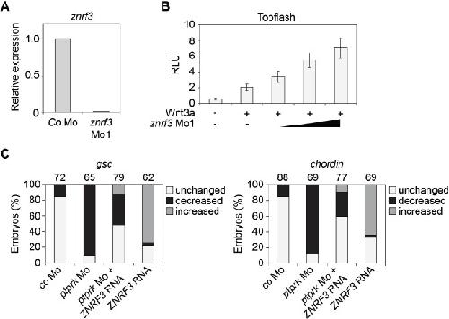 Figure 5 â figure supplement 1 | Znrf3 Mo activates Wnt signaling in Xenopus embryos (A) Knockdown efficiency of znrf3 Mo1 by qRT-PCR analysis. (B) Topflash reporter assay performed with neurula (stage 18) embryos. Embryos were injected animally at 2- to 8-cell stage as indicated. Normalized Topflash activity of Co Mo injected embryos was set to 1. (C) Quantification of the expression of the indicated genes by whole mount in situ hybridization in Figure 5D. Top, number of embryos. |