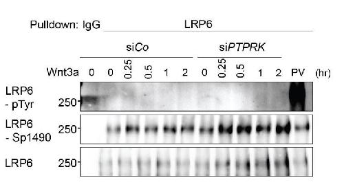 Author response image 2. PTPRK depletion does not induce LRP6 Tyrosine phosphorylation.Tyrosine phosphorylation of LRP6 in H1703 cells with Wnt3a treatment upon siRNA transfection. As a control, cells were treated with Na-pervanadate (PV, phosphatase inhibitor) for 30 min before harvest. Cells were treated with Wnt3a for the indicated time before harvest. Lysates were pulled down with anti-LRP6 antibody or control IgG and subjected to Western blot analysis. |