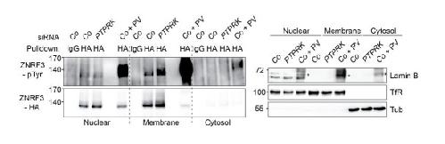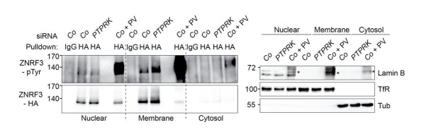 Author response image 4. PTPRK regulates tyrosine phosphorylation of ZNRF3 at the plasma membrane.Left: Tyrosine phosphorylation of ZNRF3 in TetOn ZNRF3-HA H1703 cells upon siRNA transfection after subcellular fractionation. As a control, cells were treated with Na-pervanadate (PV, phosphatase inhibitor) for 30 min before harvest. Right: Subcellular markers to validate fractionation. Lamin B: Nucleus; TfR (transferrin receptor), Plasma membrane; Tubulin, cytosol marker. Note that nuclear fraction displaying TfR signal indicates that nuclear fraction contains ER. Asterisk: non-specific bands from Na-pervanadate treatment. A representative result from two independent experiments with similar outcomes is shown. |