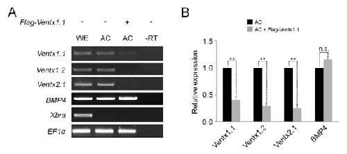 Fig. 1. Ventx1.1 represses expression of ventral-specific genes. (A) One-cell stage embryos were injected in the animal pole region with Flag-Ventx1.1 mRNA (500 pg), and animal caps were dissected from injected or uninjected embryos at stage 8 and cultured to stage 11.5 for RT-PCR analysis. EF1α serves as a loading control. WE, stage 11.5 whole embryo. AC, animal cap. −RT, control in the absence of reverse transcriptase. (B) Quantification of expression levels of ventral genes (normalized to EF1α) from three independent experiments for (A). Error bars indicates standard error (SE). |