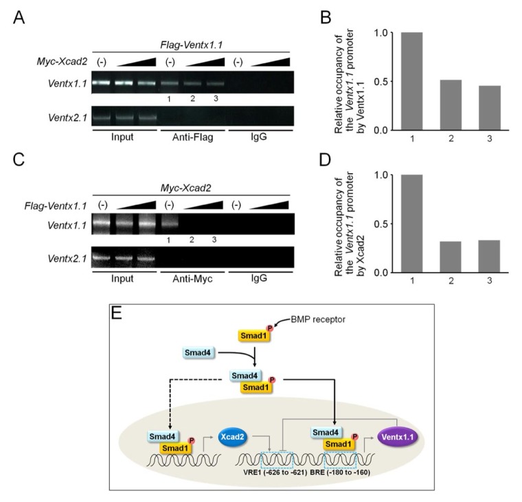 Fig. 4. Ventx1.1 and Xcad2 co-occupy Ventx1.1 promoter region in competition with each other. (A–D) Embryos were injected with a combination of Flag-Ventx1.1 (0.5 ng) and increasing doses of Myc-Xcad2 (0.5, 1 ng) or Myc-Xcad2 (1 ng) and increasing doses of Flag-Ventx1.1 (0.25, 0.5 ng) as indicated and cultured to stage 11.5 for ChIP-PCR analysis. (B, D) represent quantification of relative intensities of bands in lanes 1, 2, and 3 in (A, C), respectively. (−), no injection of Myc-Xcad2 or Flag-Ventx1.1. Ventx2.1, a negative PCR control, was amplified with its coding region-specific primers. (E) A proposed model for Ventx1.1 or Xcad2-mediated control of Ventx1.1 transcription. |