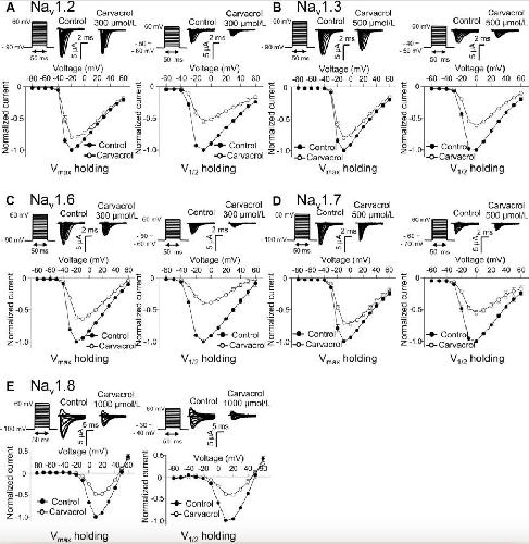Fig. 2. Effects of carvacrol on IâV curves of sodium currents in oocytes expressing Nav1.2 (A), Nav1.3 (B), Nav1.6 (C), Nav1.7 (D), and Nav1.8 (E) α subunits with β1 subunit (n = 6). Currents were elicited using 50 ms depolarizing steps between â80 and 60 mV in 10 mV increments from a Vmax holding potential (left panel) and elicited using 50 ms depolarizing steps between â60 and 60 mV in 10 mV increments from a V1/2 holding potential (right panel). Upper panel, Representative INa traces from oocytes expressing Nav1.2 (A), Nav1.3 (B), Nav1.6 (C), Nav1.7 (D), and Nav1.8 (E) α subunits with the β1 subunit in both the absence and presence of carvacrol at Vmax and V1/2 holding potential are shown. Lower panel, The effects of carvacrol on normalized IâV curves elicited from Vmax and V1/2 holding potentials are shown (closed circles, control; open circles, carvacrol). Peak currents were normalized to the maximal currents observed from â10 to +10 mV. Data are presented as means ± SEM. Nav = voltage-gated sodium channel; Vmax holding potential = holding potential causing maximal current; V1/2 holding potential = holding potential causing half-maximal current.
