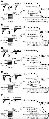 Fig. 4. Effects of carvacrol on inactivation curves in oocytes expressing Nav1.2 (A), Nav1.3 (B), Nav1.6 (C), Nav1.7 (D), and Nav1.8 (E) α subunits with β1 subunit (n = 6). Currents were elicited by a 50 ms test pulse to â20 mV for Nav1.2 and Nav1.6, â10 mV for Nav1.3 and Nav1.7, and +10 mV for Nav1.8 after 200 ms (500 ms for only Nav1.8) prepulses ranging from â140 mV to 0 mV in 10 mV increments from a Vmax holding potential (A) Left panel, Representative INa traces from oocytes expressing Nav1.2 (A), Nav1.3 (B), Nav1.6 (C), Nav1.7 (D), and Nav1.8 (E) α subunits with the β1 subunit in both the absence and presence of carvacrol are shown. Right panel, Effects of carvacrol on inactivation curves (closed circles, control; open circles, amitriptyline) are shown. Steady-state inactivation curves were fitted to the Boltzmann equation and the V1/2 values are shown in Table 1. Data are expressed as means ± SEM. Nav = voltage-gated sodium channel.