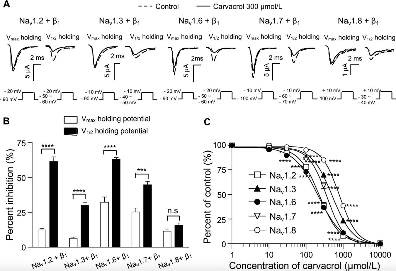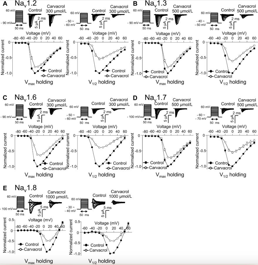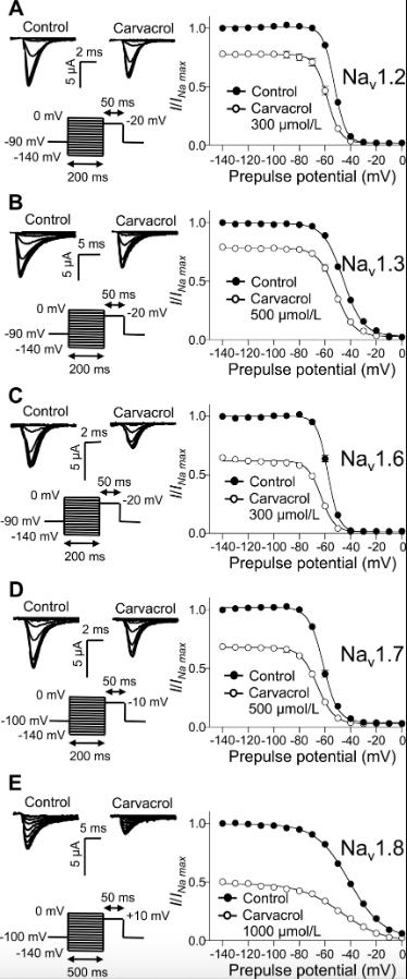 Carvacrol inhibits the neuronal voltage-gated sodium channels Nav1.2, Nav1.6, Nav1.3, Nav1.7, and Nav1.8 expressed in Xenopus oocytes with different potencies.