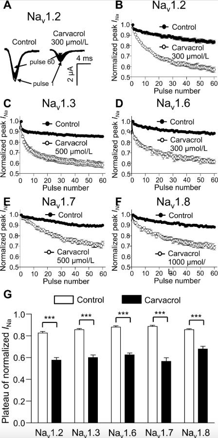 Fig. 5. Use-dependent blockage of sodium channels on Nav1.2, Nav1.3, Nav1.6, Nav1.7, and Nav1.8 α subunits with β1 subunit by carvacrol (n = 6). Currents were elicited at 10 Hz by a 20 ms depolarizing pulse of â20 mV for Nav1.2 and Nav1.6, â10 mV for Nav1.3 and Nav1.7, and +10 mV for Nav1.8 from a V1/2 holding potential in both the absence and presence carvacrol. (A) Representative INa traces from oocytes expressing Nav1.2 α subunit with the β1 subunit in both the absence and presence of carvacrol are shown. Peak currents were measured and normalized to the first pulse and plotted against the pulse number (B, Nav1.2; C, Nav1.3; D, Nav1.6; E, Nav1.7; F, Nav1.8). Closed circles and open circles represent control and the effect of carvacrol, respectively (G) Data were fitted to the monoexponential equation and values for fractional blockage of the plateau of normalized INa are shown (open columns and closed columns represent control and the effect of carvacrol, respectively). Data are expressed as means ± SEM. ***P < 0.001, compared to the control, based on paired t-test (two-tailed). Nav = voltage-gated sodium channel.