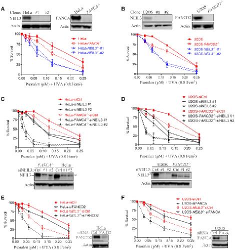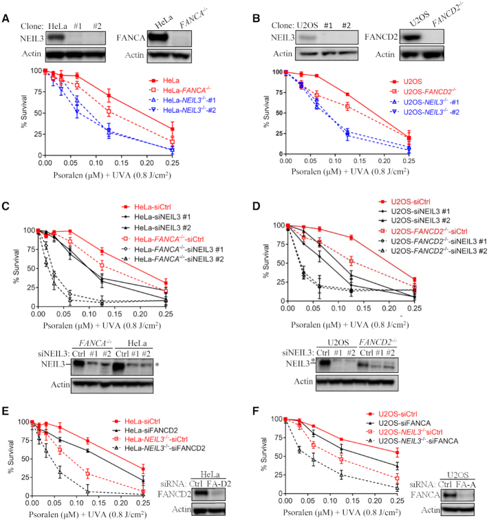 Figure 1. NEIL3 pathway plays a dominant role in psoralen-ICL repair in human cells. (A, B) Single cell HeLa-NEIL3-/-, U2OS-NEIL3-/-, HeLa-FANCA-/- and U2OS-FANCD2-/- clones were validated by Western blot. Cell viability was measured by CellTiter-Glo assays (Promega). PUVA, psoralen plus UVA. knockout cell lines were generated by CRISPR-Cas9. Guide RNA sequences and method used are shown in Materials and Methods. (C, D) Cell viability after PUVA treatment was measured after NEIL3 knockdown in HeLa WT versus HeLa-FANCA-/- and U2OS WT versus U2OS-FANCD2-/- cells. Western blots show that NEIL3 was knocked down. *Asterisk indicates a non-specific band above the NEIL3 band detected by the NEIL3 antibody. (E, F) PUVA sensitivity was determined after knockdown of FANCA or FANCD2 in U2OS-NEIL3-/- and HeLa-NEIL3-/- cells, respectively. Western blots show successful knockdown of FANCD2 and FANCA. Data are mean ± standard error of the mean (s.e.m.) from three independent experiments.