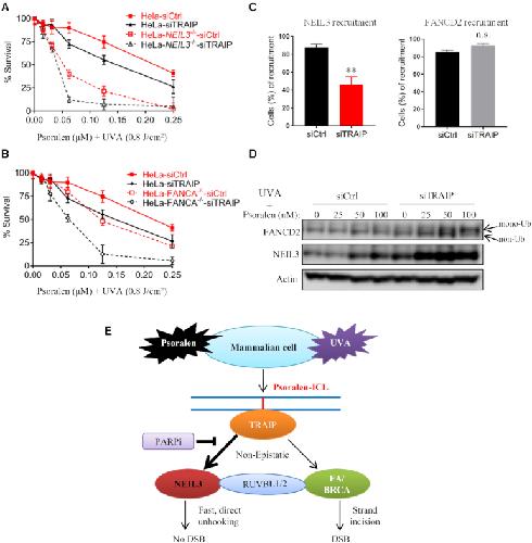 Figure 6. TRAIP show synthetic lethality with both the NEIL3 pathway and the FA pathway upon PUVA treatment. (A, B) Cell viability was measured after knockdown of TRAIP and PUVA treatment in WT, FANCA-/- and NEIL3-/- HeLa cells. (C) PUVA laser striping was used to analyze the recruitment efficiency of NEIL3-EGFP and EGFP-FANCD2 in U2OS cells after siRNA knockdown of TRAIP. A total of 100 cells were counted in each group. **P < 0.01, n.s., no significance (paired t test). (D) FANCD2 and NEIL3 were analyzed by Western blotting in cell lysates from HeLa cells, which were transfected with control or TRAIP siRNA and treated with PUVA. (E) A model showing the NEIL3 pathway in psoralen-ICL repair in the context of the FA/BRCA pathway.