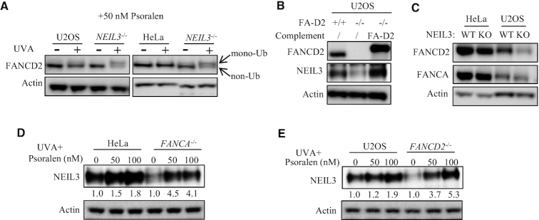 Figure 2. The relationship between the NEIL3 and the FA/BRCA pathways in psoralen-ICL repair. (A) WT and NEIL3-/- cells were treated with PUVA (pre-incubated with 50 nM psoralen for 30 min and then irradiation with 0.8 J/cm2 UVA). 24 h after PUVA, the level of FANCD2 mono-ubiquitination was detected by WB to determine activation of the FA/BRCA pathway. (B) U2OS-FANCD2-/- cells were complemented with EGFP-FANCD2 and NEIL3 expression level was determined by western blot in those cells. (C) The FANCA and FANCD2 expression levels were determined in wild-type and NEIL3 deficiency cells. (D, E) The NEIL3 expression level was determined in wild-type and FANC gene deficiency cells, 24 h after being treated with indicated dose of psoralen plus UVA (0.8 J/cm2) irradiation. Quantification of the Western blots was performed by ImageJ software and data were normalized to no psoralen.
