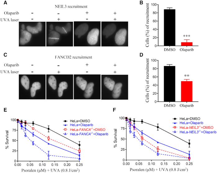Figure 4. PARP is essential for NEIL3 recruitment to psoralen-ICLs and facilitates FANCD2 recruitment. (A) Recruitment of NEIL3 to PUVA laser tracts. U2OS cells expressing NEIL3-GFP were pre-incubated with 10 μM psoralen and the recruitment of NEIL3 was visualized 1 min after exposure to UVA laser. PARP inhibitor (olaparib) was added 1 hour before laser striping. (B) Quantification of the NEIL3 recruitment to psoralene-ICL laser tracts after treatment with DMSO or olaparib. A total of 100 cells were quantified for each group. (C) U2OS cells stably expressing EGFP-FANCD2 were pre-treated with 10 μM psoralen for 1 h before laser striping. Recruitment efficiency was determined 10 min after exposure to UVA laser. Olaparib or DMSO was added 1 h before laser striping. (D) Quantification of the recruitment efficiency of EGFP-FANCD2 after treatment with DMSO or olaparib, as shown in (C). A total of 100 cells were counted for each group. (E, F) PUVA sensitivity was determined in WT, FANCA-/- and NEIL3-/- HeLa cells after DMSO or olaparib treatment. CellTiter-Glo cell viability assays were performed. Mean and s.e.m. of three independent experiments are shown. **P < 0.01; ***P < 0.001 (paired t test).
