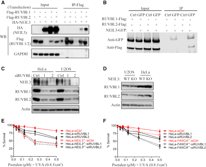 Figure 5. The RUVBL1/RUVBL2 complex is involved in psoralen-ICLs repair via the NEIL3 pathway. (A) 293T cells were transiently transfected with indicated plasmids, and co-IP were performed using anti-Flag antibody. WB of the inputs and IPs are shown to detect interactions. (B) 293T cells were transiently transfected with indicated plasmids, and co-IP were performed using normal IgG or anti-GFP antibody. WB of the inputs and IPs are shown to detect interactions. (C) NEIL3 protein levels were analyzed after knockdown of RUVBL1 or RUVBL2 in HeLa or U2OS cells. (D) RUVBL1 and RUVBL2 protein levels were analyzed by WB in WT and NEIL3-/- cells. (E, F) Cell viability was measured and compared after knockdown of RUVBL1 or RUVBL2 and PUVA treatment in WT, NEIL3-/- (E) and FANCA-/- (F) HeLa cells. CellTiter-Glo cell viability assays were performed.
