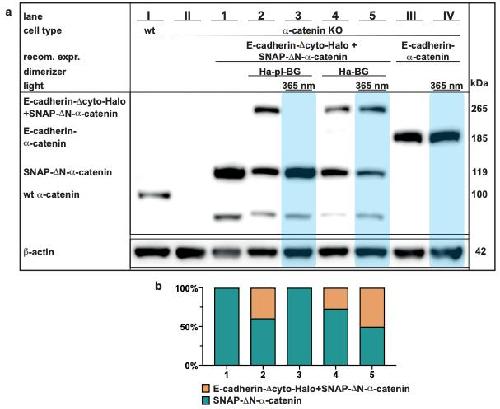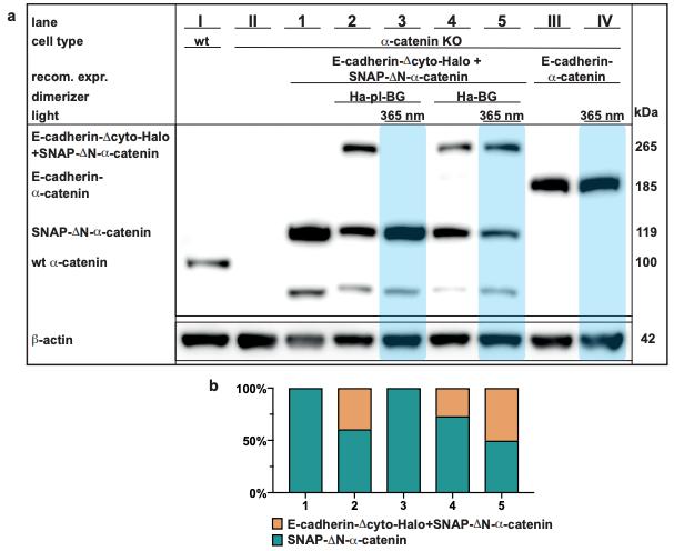Supplementary Figure 2: Western blot analysis of E-cadherin-a-catenin complexes in acatenin KO cells and their stability after 365 nm light. (a) Full view of the Western blot presented in Figure 2 c comparing the a-catenin level of A431 wild type cells (lane I) expressing endogenous a-catenin (100 kDa) against untransfected A431 a-catenin KO cells (lane II) expressing no a-catenin and A431 a-catenin KO cells stably coexpressing E-cadherinDcyto-Halo (not stained) and SNAP-DN-a-catenin (119 kDa, lanes 1-5) or the stable Ecadherin-a-catenin fusion protein (185 kDa, lanes III and IV). Lane 1-5 have been discussed in Figure 2c. The integrity of the E-cadherin-a-catenin fusion protein is not effected by the 365 nm light that was used to cleave Ha-pl-BG. (b) Normalized quantification of the unbound SNAPDN-a-catenin (dark green) versus SNAP-DN-a-catenin in complex with E-cadherin-DcytoHalo (orange). Note that although less then 50% of the SNAP-DN-a-catenin proteins are bound, the amount of formed complexes is sufficient to induce morphological changes as presented in Figure 2a,b. |