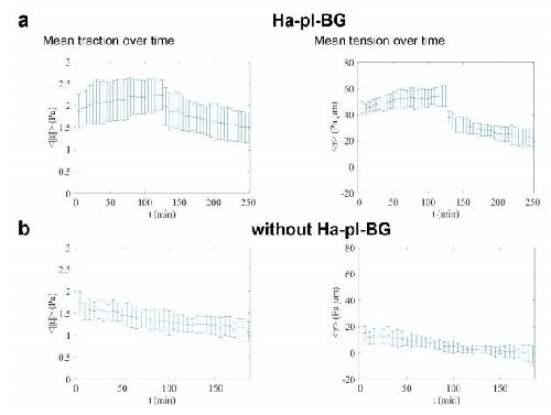 Supplementary Figure 7: Mean traction and tension values computed over time for A431 αcatenin knockout cells migrating (a) after addition of the Ha-pl-BG dimerizer and (b) in absence of the Ha-pl-BG dimerizer. Error bars indicate s.d. (number of fields analyzed over time n=5 in a and n=3 in b). |