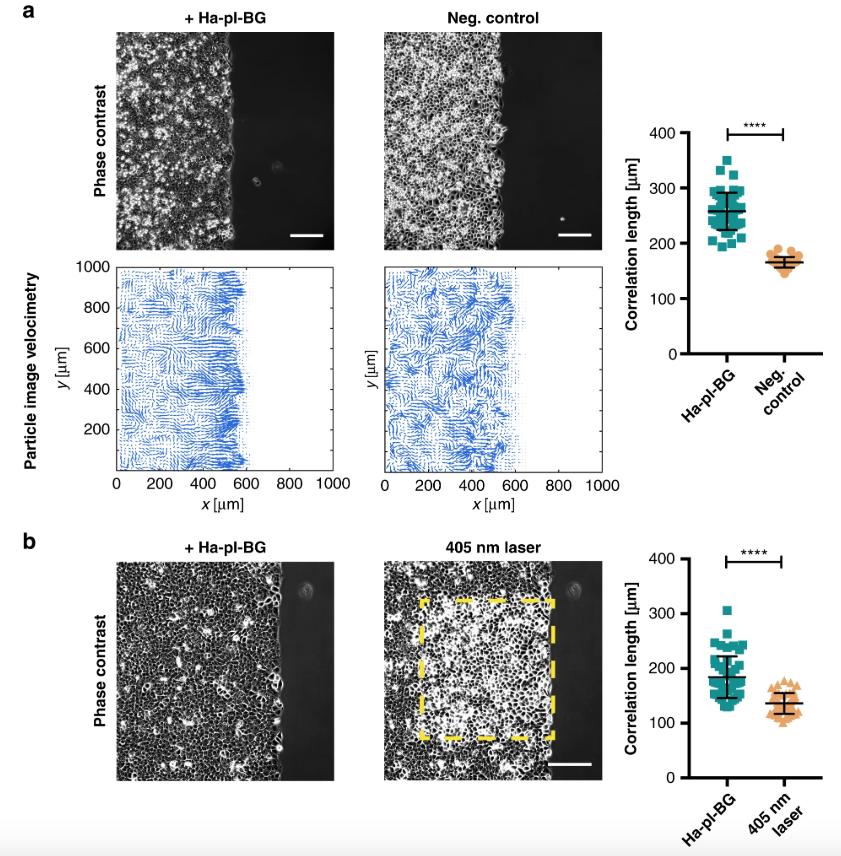 Fig. 5: LInDA has an impact on the collective behavior of epithelial monolayers. a) PIV analysis of cell migration. Vector fields of cell velocities from two consecutive frames were calculated from phase contrast images to determine the lateral velocity correlation length as a measure of collectivity. Cells treated with Ha-pl-BG show a significantly higher velocity correlation length then the untreated control cells (neg. control). Scale bar 200âµm. nâ=â192 (48 time points from 4 positions) for cells with dimerizer (dark green squares) and untreated control (orange circles), respectively. ****pâ<â0.0001 by unpaired t-test with Welch´s correction. b) PIV analysis of dimerizer treated cells before and after light-induced dissociation of AJs shows a significant reduction of collectivity in the targeted cells as measured by the velocity correlation length. Scale bar 200âµm. nâ=â48 (12 time points from 4 positions) for cells before (dark green squares) and after 405ânm exposure (orange circles), respectively. ****pâ<â0.0001 by unpaired t-test with Welchʼs correction. |