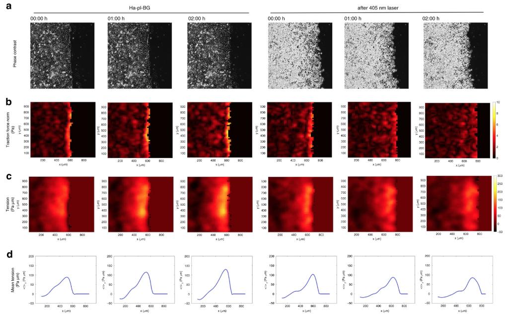 Fig. 6: LInDA changes the internal tension of epithelial monolayers. a) Phase contrast images of migrating cells treated with Ha-pl-BG. Shown are three selected time points from a continuous time lapse recording before (Ha-pl-BG) and after cleaving the dimerizer (after 405 nm laser). b) Heat maps of traction force norm in the same spatial domain as a. Traction Force Microscopy analysis of migrating cells shows that the norms of traction forces are gradually reduced after photocleavage of the Ha-pl-BG dimerizer. c, d) Internal stresses are estimated applying Bayesian Inversion Stress Microscopy (BISM) on traction force data. BISM analysis shows that the monolayer tension is also reduced after exposure of the migrating monolayer to UV light pulse. c) Heat maps of the mechanical tension in the same spatial domain as in a. d) 1D profile of the tension averaged over the direction parallel to the moving front. |