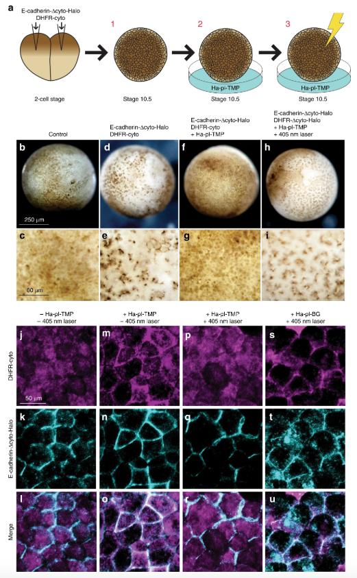 Fig. 7: LInDA tools affect epithelial integrity in vivo. a) Diagram of the experimental setup. Xenopus embryos were injected with DHFR-cyto and E-cadherin-Îcyto-Halo at the two-cell stage and imaged at stage 10.5, with or without the dimerizer and with or without exposure to a 405ânm laser. bâi) Epidermal dissociation was observed by co-injection of DHFR-cyto and E-cadherin-Îcyto-Halo (d, e) compared to wild type controls (b, c), which was rescued by incubation with the dimerizer (f, g). Dissociation was induced by photocleavage under a 405ânm laser (h, i). jâu,) DHFR-cyto is cytosolic and E-cadherin-Îcyto-Halo is localized to the cell contact (jâl). Upon the addition of Ha-pl-TMP dimerizer, DFHR-cyto translocates to the cell contact (mâo), which can be disrupted by exposure to blue light (pâr). Blue light fails to prevent accumulation of DHFR-cyto at the cell contact when embryos are incubated with the non-photocleavable Ha-TMP dimerizer (sâu). |