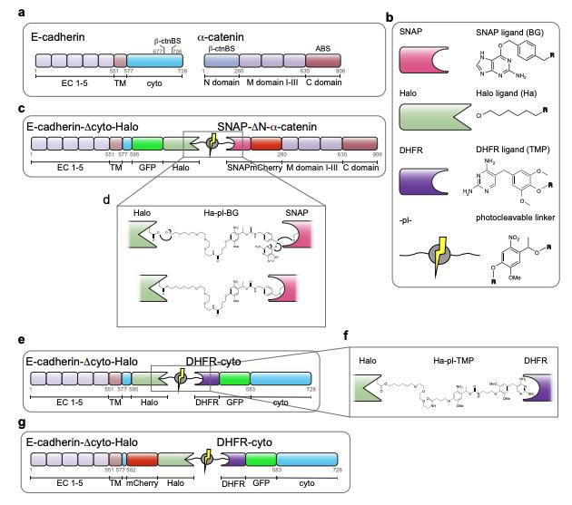 Supplementary Figure 1: Reconstituting the link between E-cadherin and a-catenin with chemical dimerizers. (a) E-cadherin is a membrane spanning adhesion protein with an extracellular part consisting of five homologous domains (EC1-5). The transmembrane region (TM) is connected to the cytosolic domain which carries the b-catenin binding site (b-ctnBS). a-catenin has a b-ctnBS in the N terminal domain, which is followed by a tripartite middle domain (M domain I-III) and the F-actin binding site (ABS). The minimal mechanotransducing connection from the contractile actomyosin network to E-cadherin is maintained by the link to a-catenin via b-catenin. (b) Chemical structures of the functional groups of the heterobifunctional small molecules combining the chloro-hexane (Halo) ligand of Halo tag and the benzyle guanine (BG) ligand of SNAP tag or the dihydrofolate reductase (DHFR) ligand trimethoprim (TMP) via a flexible polyethylene linker. The photocleavable linker (pl) contains the light sensitive dimethoxy-nitrophenyle group. (c) To establish the link between E-cadherin and a-catenin, most of the cytosolic domain of E-cadherin was replaced with a Halo tag leaving only a 22 amino acid linker sequence that has no binding sites for AJ complex proteins. The N domain of a-catenin was replaced by SNAP tag. For live cell imaging GFP was inserted between E-cadherin and Halo tag and mCherry between SNAP tag and a-catenin domain. (d) When the photocleavable dimerizer Ha-pl-BG is added to the culture medium of cells co-expressing E-cadherin-Dcyto-Halo and SNAP-DN-a-catenin the SNAP and Halo tag bind their respective ligands covalently, thereby forming a stable link between E-cadherin and acatenin. (e) To reconstitute a split version of E-cadherin, the E-cadherin-Dcyto-Halo is coexpressed with the cytosolic tail of E-cadherin fused to DHFR and GFP. (f) The photocleavable dimerizer Ha-pl-TMP establishes a non-covalent bond with the DHFR tag. (g) For in vivo experiments, mCherry was inserted in the E-cadherin-Dcyto-Halo before the Halo tag. |