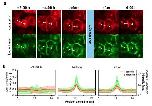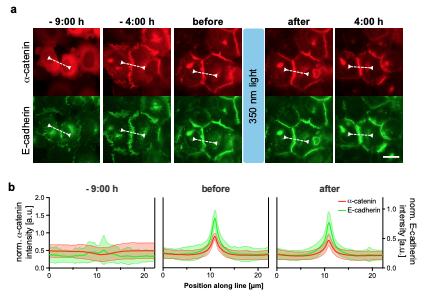Supplementary Figure 3: Adherens Junctions reconstituted with photostable dimerizer Ha-BG do not dissociate after 350 nm light pulse. (a) Addition of Ha-BG (-9:00 h) recruits the previously cytosolic a-catenin (mCherry-labled, shown in red) to the cell membrane and induces E-cadherin (GFP-labled, shown in green) mediated AJ formation (-4:00 h). Over time AJs change from irregular fringed assemblies into more defined linear structures. As indicated by the unchanged fluorescence intensity profiles, the pulse of 350 nm light has no effect on the E-cadherin-a-catenin complexes (see before and after). Note that the strong rearrangements of AJs (4:00 h) in this time lapse experiment are mainly because of cells undergoing cytokinesis. Interestingly, AJs form as soon the daughter cells start spreading. See also Supplementary Video 2. Scale bar 20 µm. (b) Intensity profiles of GFP tagged E-cadherin (green) and mCherry tagged a-catenin (red) are corresponding to the arrow headed dashed lines in the fluorescence images above. The position of the lines has been adjusted for each time point to reflect profiles perpendicular and centered to the cell-cell interface. Mean ± s.d. are shown for n=45 crosssections in multiple fields of view for each time point. |