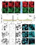 Fig. 4: Dimerizer-mediated reconstitution followed by LInDA to specifically target AJs. a) When coexpressed in α-catenin KO cells, the α-catenin (mCherry-labled, shown in red) construct is cytosolic, whereas E-cadherin (GFP-labled, shown in green) is located at the cell membrane forming unstable complexes at cellâcell-interfaces. Following addition of Ha-pl-BG (â9:00âh) AJs form (â4:00âh) and mature into defined linear structures accompanied by cell compaction (before). After a short pulse of 350ânm light the E-cadherin-α-catenin complex disassembles and α-catenin becomes cytosolic again (after and 4:00âh). E-cadherin clusters destabilize and cells disseminate. Scale bar 20âµm. b) Normalized profiles for GFP (green) and mCherry (red) fluorescence intensity in cross-sections of cellâcell contacts as measures for localization of E-cadherin and α-catenin, respectively. A representative cross-section is shown by the arrow headed dashed lines in a. The lines have been repositioned for each time point to reflect profiles perpendicular and centered to the cellâcell interface. Meanâ±âs.d. are shown for nâ=â45 cross-sections in multiple fields of view for each time point. c) Staining for desmosome proteins reveals the presence of desmoplakin at cellâcell contacts only in presence of the dimerizer and in cell tethers following the light-induced dissociation of AJs. Scale bar 20âµm for single color images and overlay image, 5âµm for 5à zoom image. |