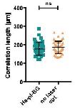 Supplementary Figure 5: Velocity correlation length is stable without photocleavage. Uncleaved control for the migration experiment described in Figure 5 b. PIV analysis of dimerizer treated cells without light-induced dissociation of AJs (no laser ctrl.) shows no significant reduction of collectivity in the observed cells as measured by the velocity correlation length. n=48 (12 time points from 4 positions) for cells before (dark green squares) and after (orange triangulars) probed cells were exposed to 405 nm, respectively. Black bars indicate mean ± s.d.; ns: not significant, p=0.2634 by unpaired t-test with Welch´s correction. |