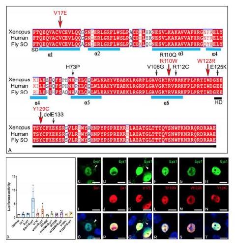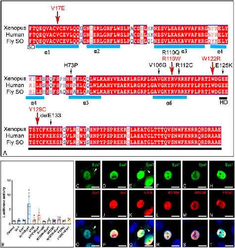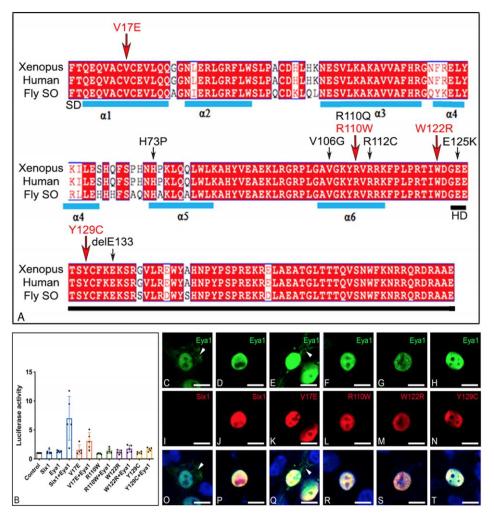 Fig. 1. BOS/BOR mutations and their transcriptional effects. (A) Amino acid alignment of the N-terminal region of Xenopus laevis Six1, human SIX1 and Drosophila Sine oculis (SO) shows a high level of identity across species; human and frog are 100% identical in this region; differences from fly are in white. The sequence shown begins with the six domain (SD), which contains six α-helices (blue bars), and ends with the homeodomain (HD, black bar). Amino acid substitutions/deletions that have been reported in human BOS/BOR patients are indicated with arrows; red arrows indicate the four mutations that were examined in this study. (B) Expression of Six1+Eya1 caused a significant â¼7-fold increase in luciferase activity when compared to activity of control vector (P<0.0001), Six1WT alone (P<0.0001) or Eya1 alone (P<0.0001). Each mutant plus Eya1 failed to significantly induce luciferase activity relative to control (V17E, P=0.27122; R110W, P=0.99999; W122R, P=0.99764; Y129C, P=0.99947) or in the absence of Eya1 (V17E, P=0.99988; R110W, P=0.99999; W122R, P=0.99999; Y129C, P=0.99999). Experiments were repeated five independent times and subjected to a one-way ANOVA with Tukey post hoc multiple comparisons test. Bars=mean±s.d. (C,I,O). HEK293T cells transfected with only Myc-Eya1 show both cytoplasmic (arrowheads) and nuclear localization. (D,J,P) Cells co-transfected with both Six1WT-FLAG and Myc-Eya1 show nuclear colocalization of both proteins. (E,K,Q) Those transfected with both V17E-FLAG and Myc-Eya1 showed nuclear colocalization and some cytoplasmic Eya1 (arrowheads). Those transfected with (F,L,R) R110W-FLAG and Myc-Eya1, (G,M,S) W122R-FLAG and Myc-Eya1, or (H,N,T) Y129C-FLAG and Myc-Eya1 showed exclusive nuclear colocalization. Scale bars: 10â µm. |