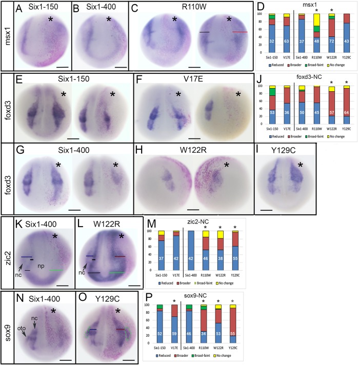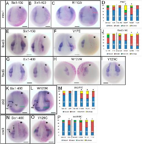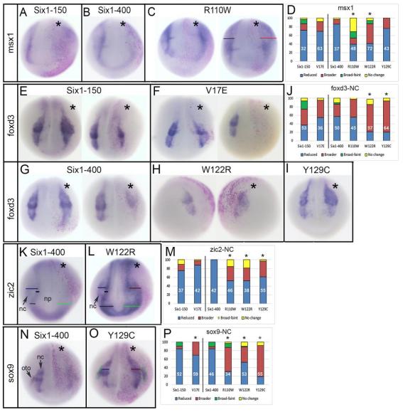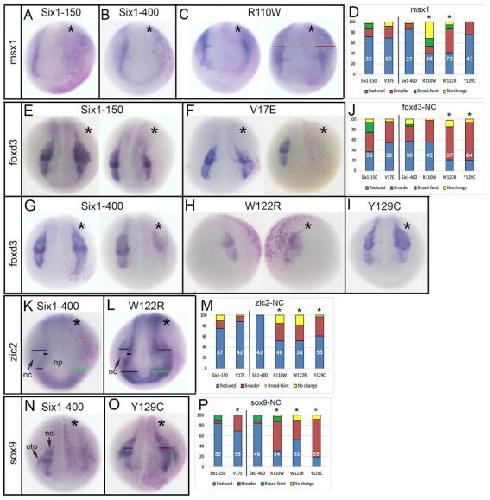 Figure 2: Changes in neural border and neural crest gene expression. (A, B) Both Six1- 150 and Six1-400 reduce the neural border expression of msx1 on the injected side (*, pink lineage tracer). (C) R110W either did not change the msx1 domain (left embryo) or caused it to be broader (right embryo, red bar) compared to the control side (black bar). (D) The expression domain size of msx1 on the Six1 mutant injected side was compared to the control side of the same embryo and scored as reduced (blue), broader (red), broader but fainter (green) or unchanged (yellow). Phenotypes are expressed as frequencies and the sample size is within each bar (white numbers); experiments were repeated a minimum of three times. Frequencies for Six1 mutants were compared to embryos injected with Six1 WT mRNA; V17E was compared to Six1-150, and the others were compared to Six1-400. Significant differences between mutant and WT frequencies were assessed by the Chi-squared test (*, p<0.05). (E) Six1-150 could either broaden (left embryo) or reduce (right embryo) the foxd3 domain. (F) V17E could either broaden (left) or reduce (right) the foxd3 domain. (G) Six1- 400 could either broaden (left) or reduce (right) the foxd3 domain. W122R (H) and Y129C (I) predominantly broadened the foxd3 domain. (J) Quantitation of foxd3 neural crest (NC) phenotypes, as in (D). (K) Six1-400 broadened the anterior neural plate domain (thin green bar) of zic2, but reduced its neural crest domain (compare to black bars [neural plate, np] and blue bar [neural crest, nc]). (L) W122R caused both the anterior neural plate domain (green bar) and neural crest domain (red bar) of zic2 to broaden (compare to black and blue bars on control side). (M) Quantitation of zic2 neural crest (NC) phenotypes, as in (D). (N) Six1-400 reduced both the neural crest and otic placode (oto) domains of sox9. (O) Y129C broadened both the neural crest (red bar) and otic placode (green outline) domains of sox9. (P) Quantitation of sox9 neural crest (NC) phenotypes, as in (D). |